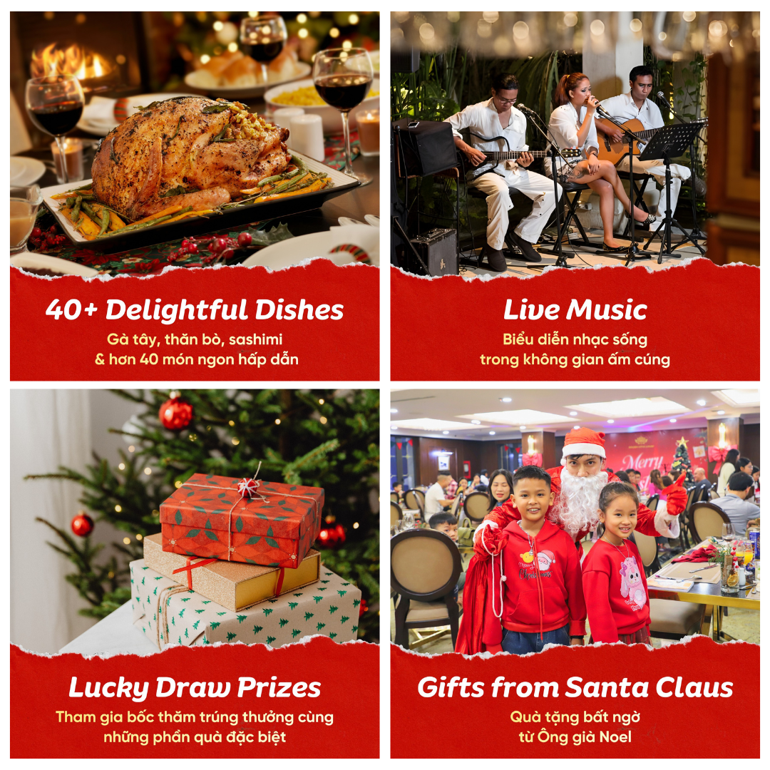 Đêm tiệc không chỉ là hành trình của ẩm thực mà còn là nơi mang đến niềm vui bất ngờ cho cả gia đình với chương trình bốc thăm trúng thưởng và các hoạt động giải trí được chuẩn bị riêng cho dịp Giáng Sinh. Đây là khoảnh khắc lý tưởng để các gia đình, cặp đôi và nhóm bạn tạo nên những kỷ niệm đáng nhớ trong mùa lễ hội cuối năm.
